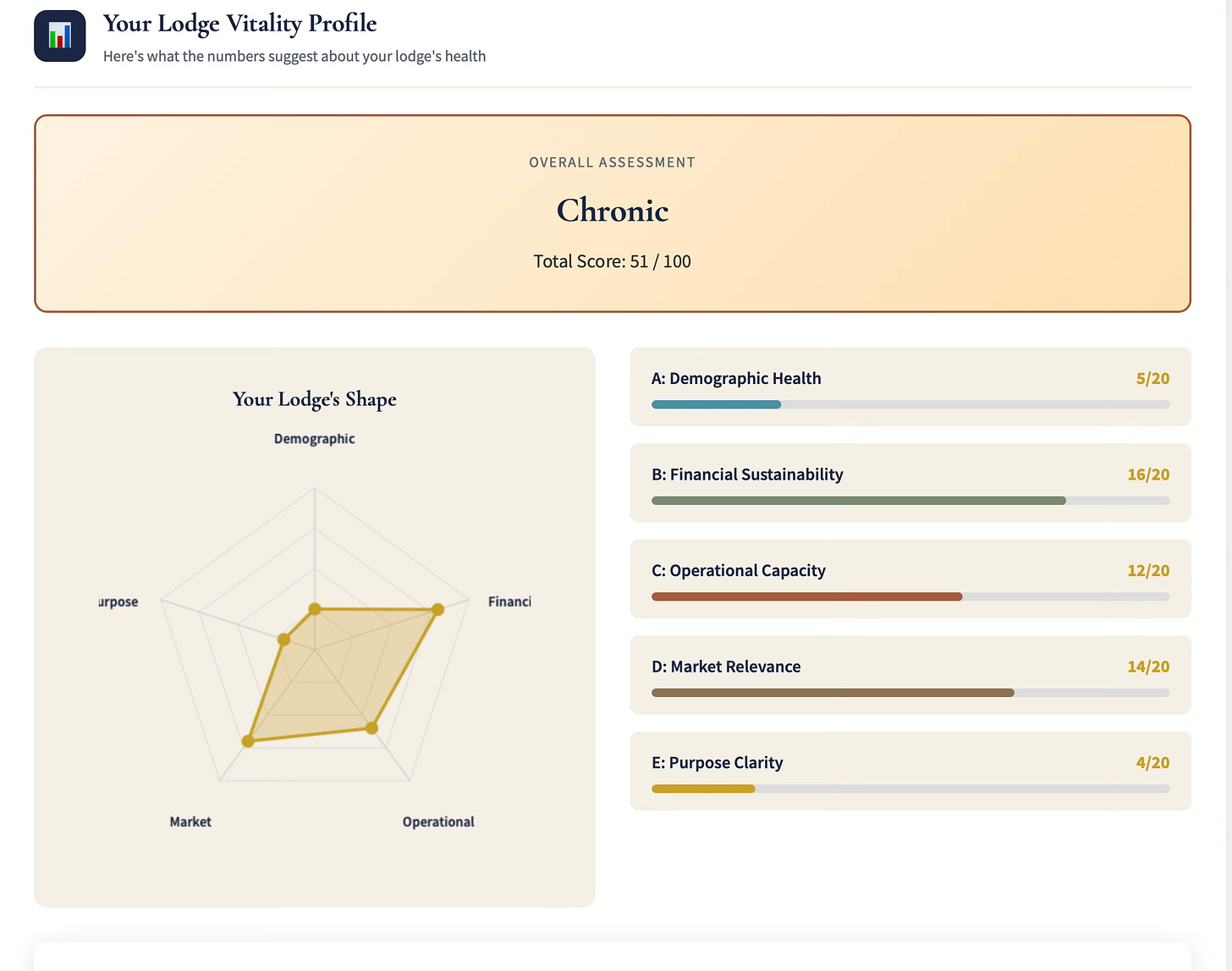 A note on what this is and isn’t. This tool is WebMD for your lodge. It’s not a full diagnosis. It’s a starting point.