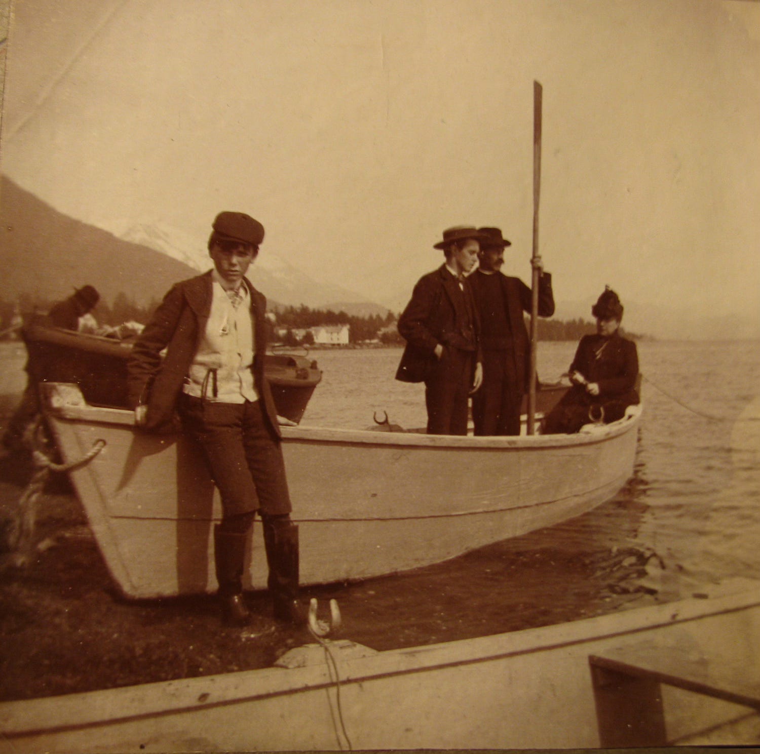 Rowe and family in Sitka, circa 1897 - Rev. Rowe is in the boat holding the paddle