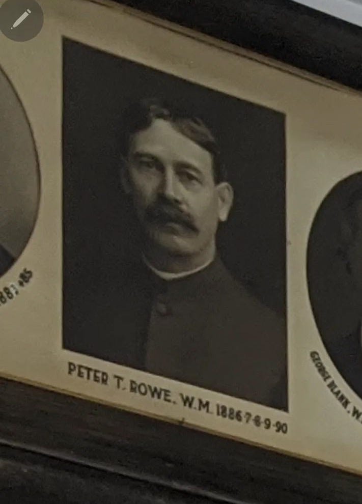 I walked into our dining room and looked at the composite photographs of our Past Masters. There he was: “PETER T. ROWE, W.M. 1886-7-8-9-90.” Five consecutive years as Worshipful Master.
