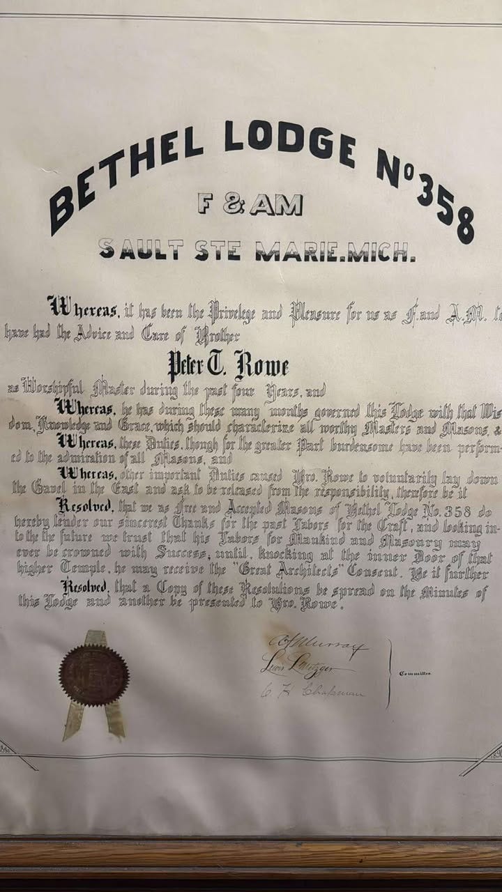 Was Rowe a charter member of Bethel Lodge? He arrived in Sault Ste. Marie in 1882, the same year the lodge was chartered. The coincidence suggests possible involvement, but I have not yet confirmed his presence on the charter roll.