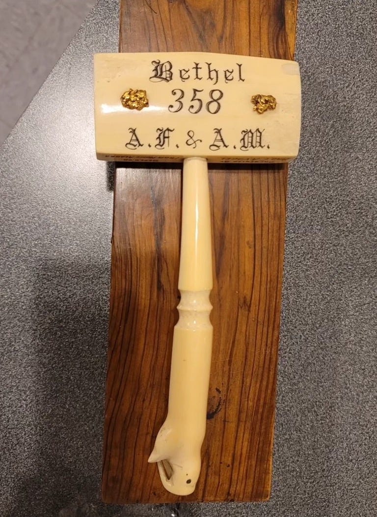 There’s another artifact in our safe: a gavel carved from whale bone, with raw Alaska gold nuggets embedded in the head. “Bethel 358, A.F. & A.M.” The mounting board reads: “Presented by C.A. Vogel.”